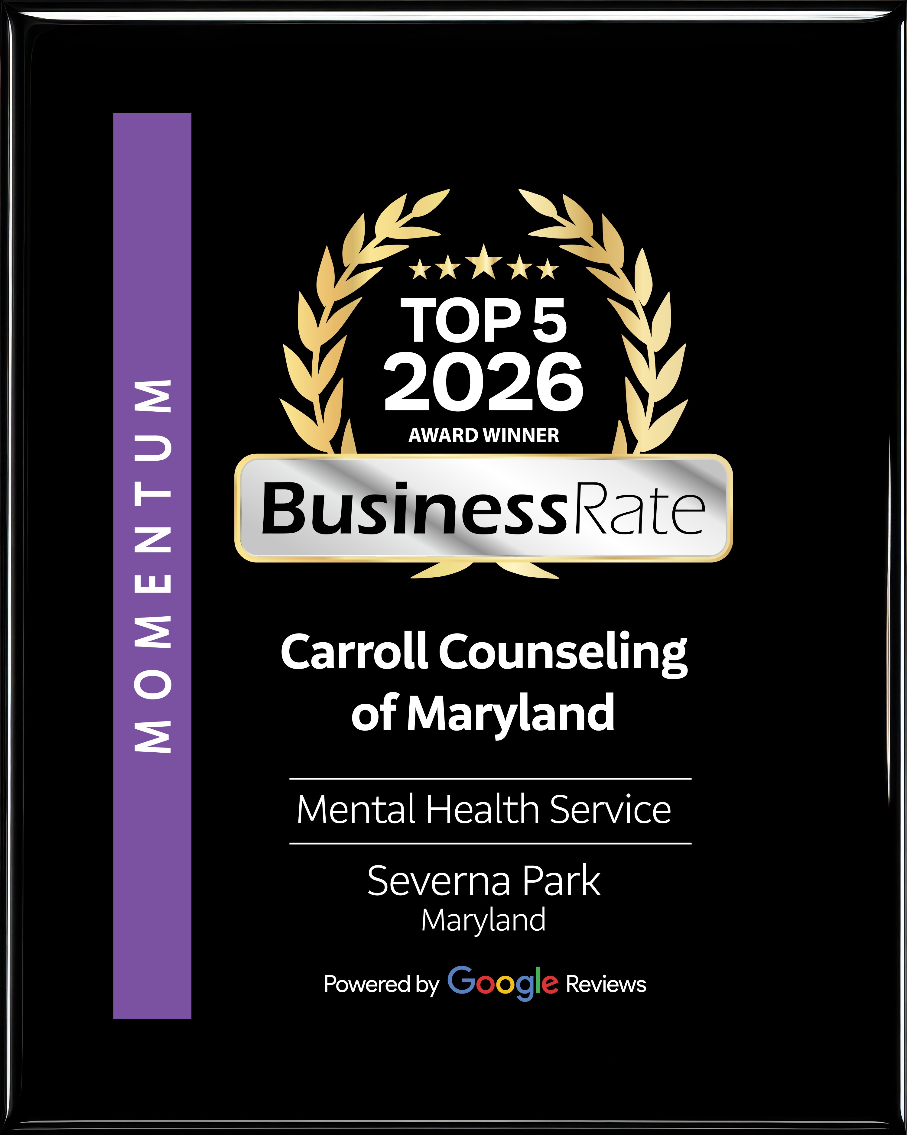 Carroll Counseling of Maryland is honored to be recognized with the 2025 and 2026 “Best of BusinessRate” Award for Mental Health Services in Mt. Airy and Severna Park. This distinction, based on recent Google reviews from May 2025, highlights our ongoing commitment to providing compassionate, high‑quality mental health care to the community. We are grateful for the trust our clients place in us and remain dedicated to supporting individuals and families with exceptional counseling services.
